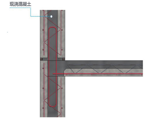 疊合墻與現(xiàn)澆墻通過(guò)預(yù)制墻內(nèi)伸出的水平鋼筋連接成為一體,此種連接方式保證即使內(nèi)外頁(yè)墻沒(méi)有被桁架筋連接牢固也能使內(nèi)外頁(yè)墻很好的與現(xiàn)澆墻連接為一體。有些地區(qū)通過(guò)空腔內(nèi)設(shè)置短鋼筋與暗柱連接為一體,此種方式施工更方便,但是對(duì)構(gòu)件生產(chǎn)和施工都有較高的要求。
